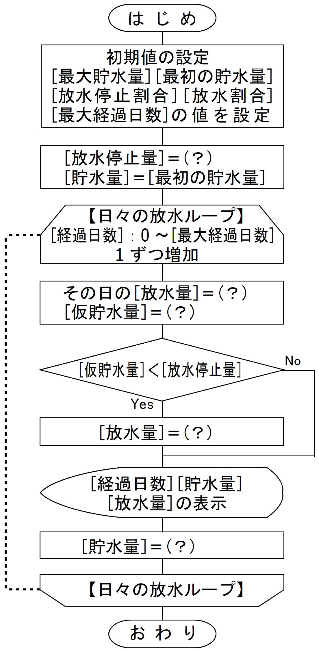 │ 表示する(day,"日:貯水量",chosui,":放水量",hosui)